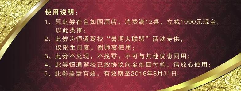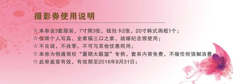 活动期内,高三应届毕业生、大学生到恒通驾校报名学车,立返超千元“暑期大联盟”礼包,带你吃、喝、玩、乐、购,畅行青春路!等于花一份钱学车,送你“唱歌、吃饭、拍照、超值购物”一条龙服务!